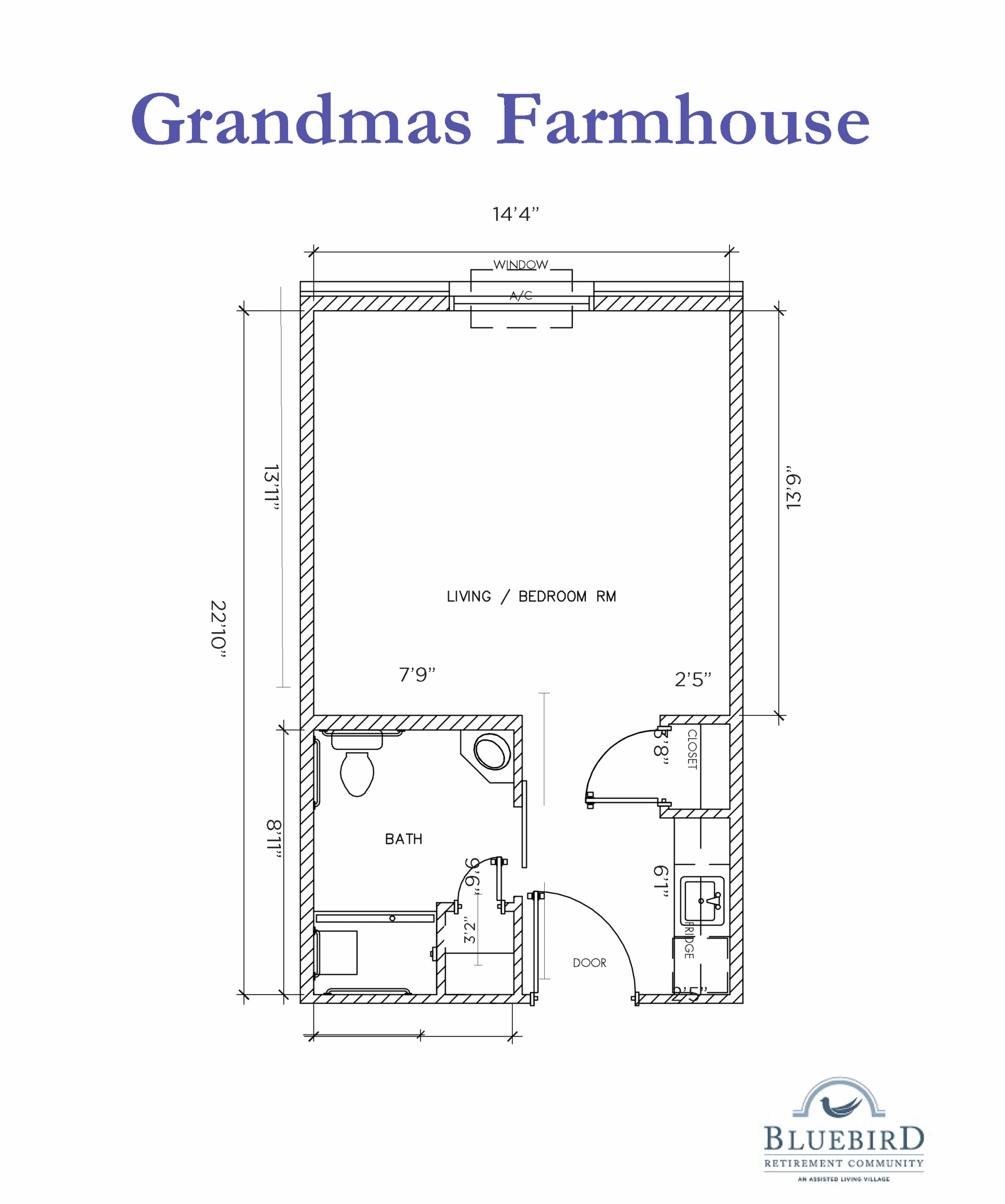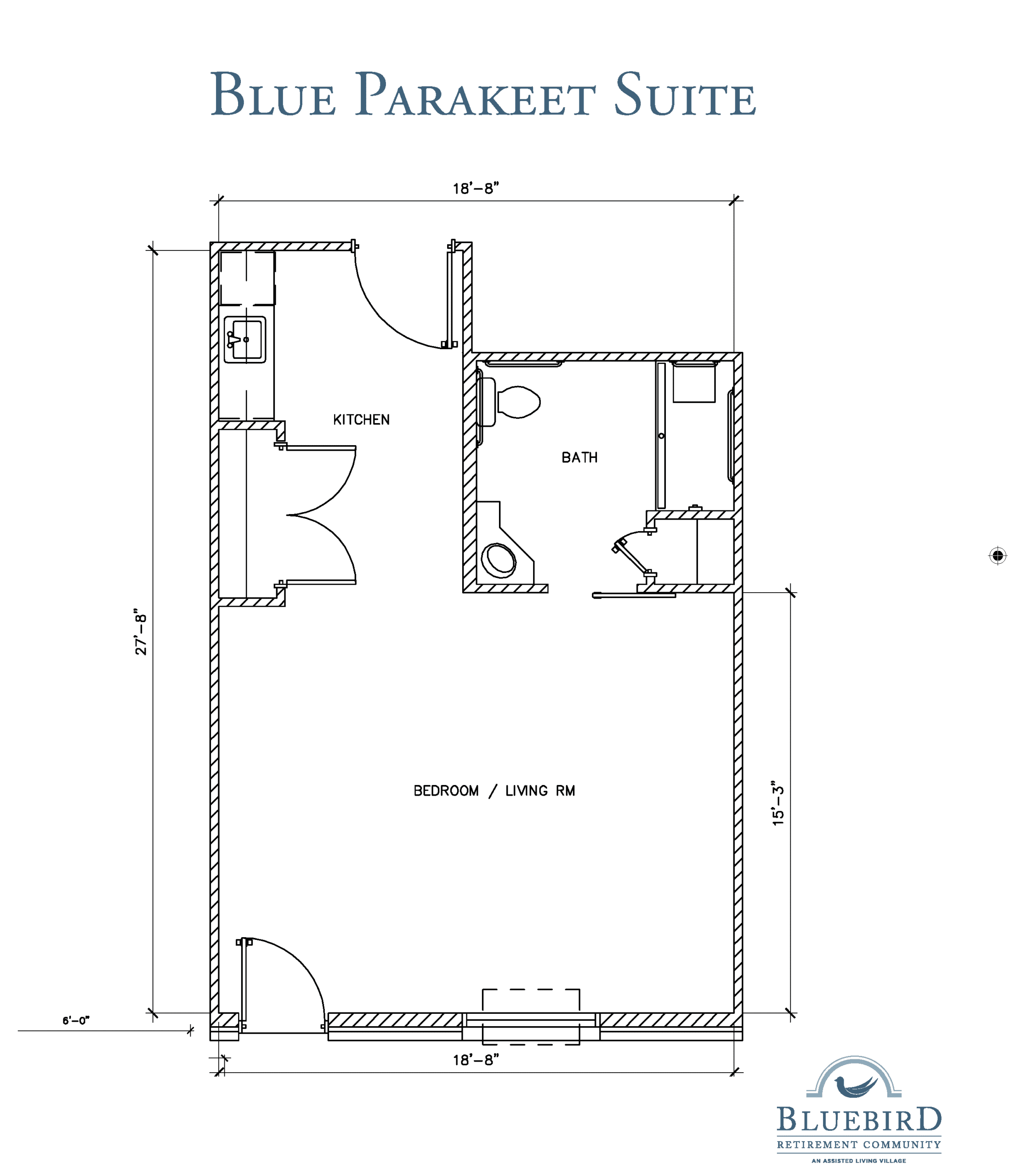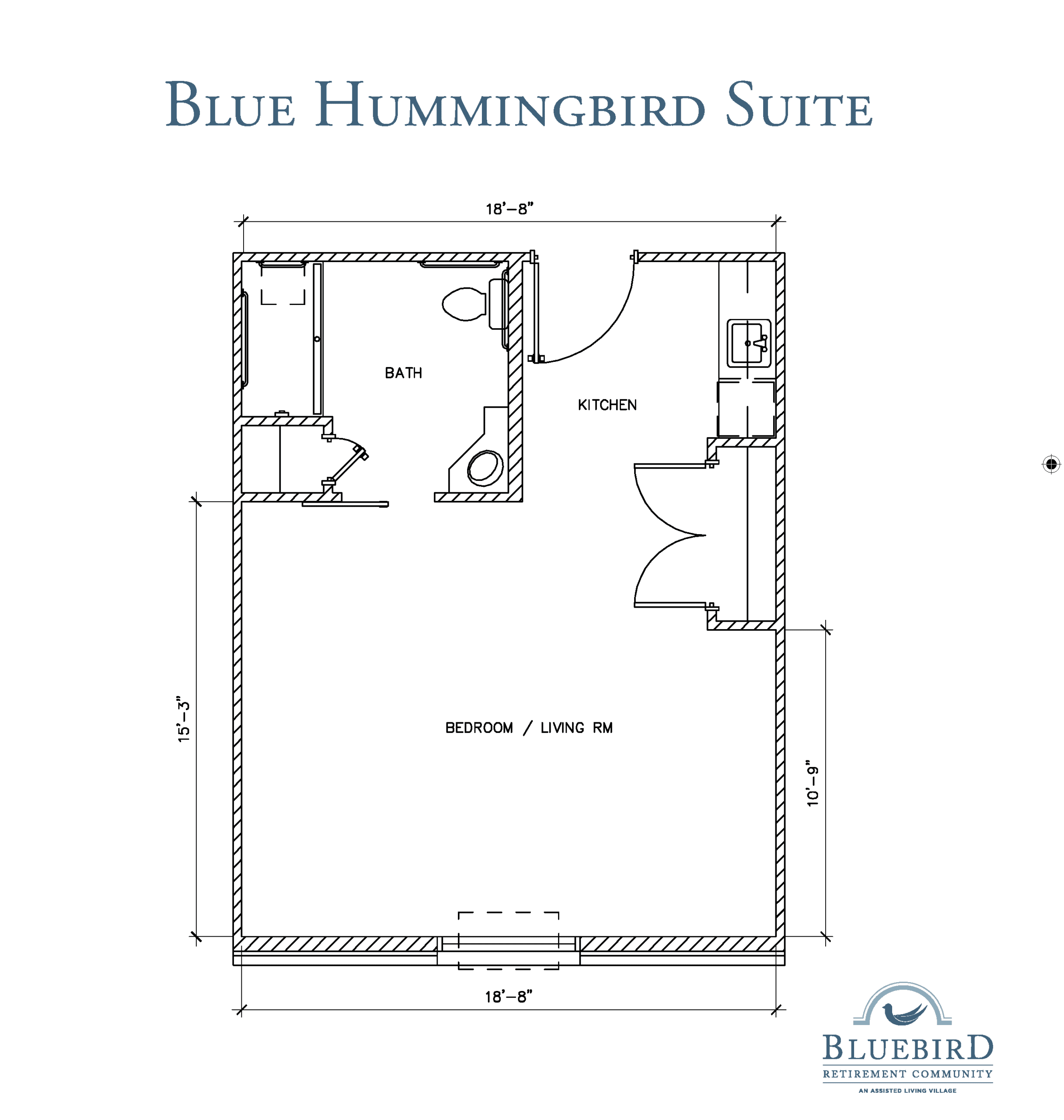 The Blue Hummingbird Suite offers 342 sq ft of living space for residents seeking a simple studio to relax in. This charming suite boasts a combined living/bedroom area, a kitchenette, and a full bathroom. You also control your own cooling and heating in this suite.